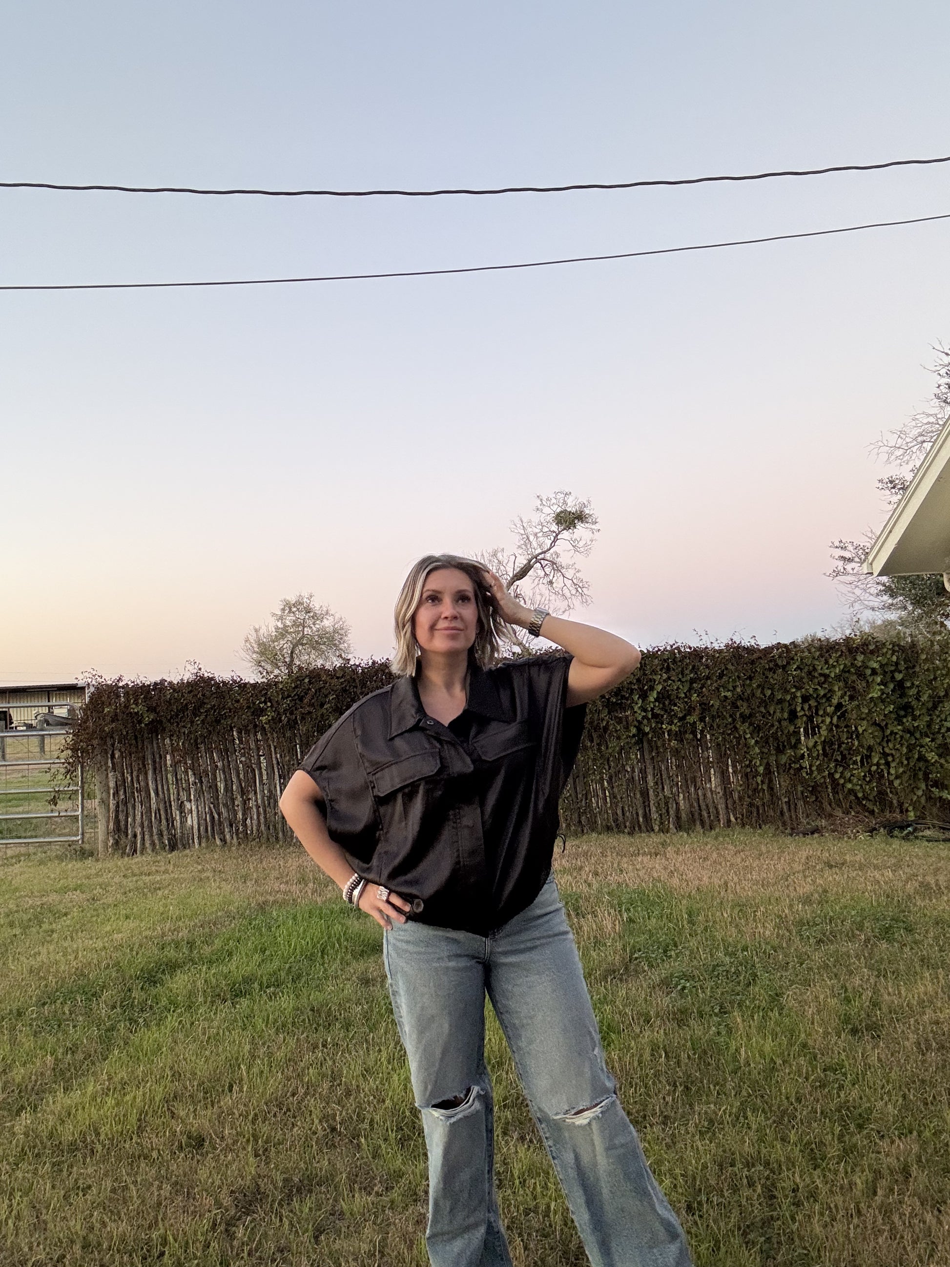 BLACK SATIN FRONT POCKET TOP